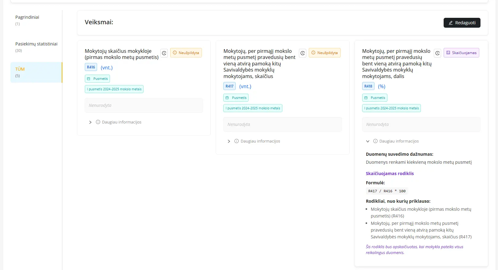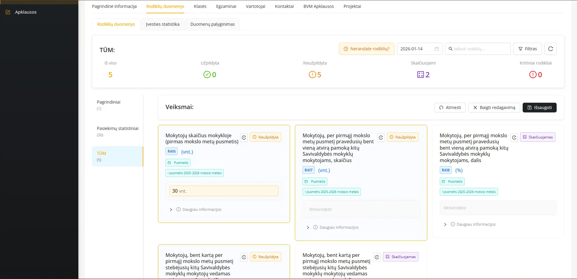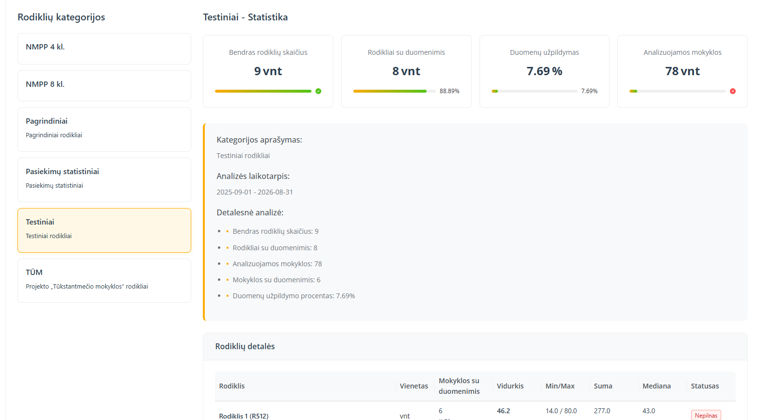 - Indicators are organized into structured categories (Core, Achievement Statistics, Testing, TŪM, and others)